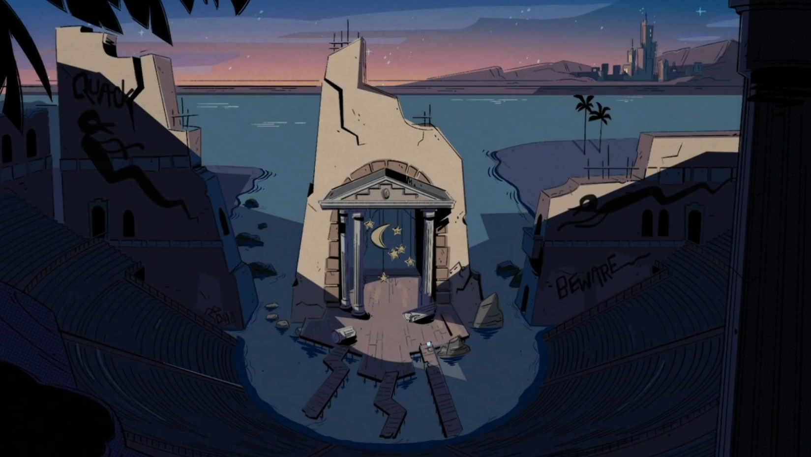 The Abandoned Amphitheater is the former home of Lena Sabrewing where she and Magica De Spell schemed to steal Scrooges number one dime. Once Lena returned from the Shadow Realm, Lena moved in with Violets family instead of going back to the Amphitheater. It first appeared in the DuckTales (2017) episode The Beagle Birthday Massacre!.
