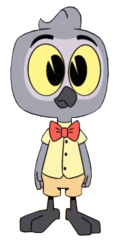 B.O.Y.D. is a small grey parrot robot with yellow sclerae and black irises, which would later become blue after being fixed in [[Astro B.O.Y.D.!]]. He has a patch of a lighter grey surrounding his eyes, and his beak and feet share the same dark grey coloring. B.O.Y.D.'s outfit consists of a light-yellow button-up t-shirt, a red bow tie, and darker yellow shorts.