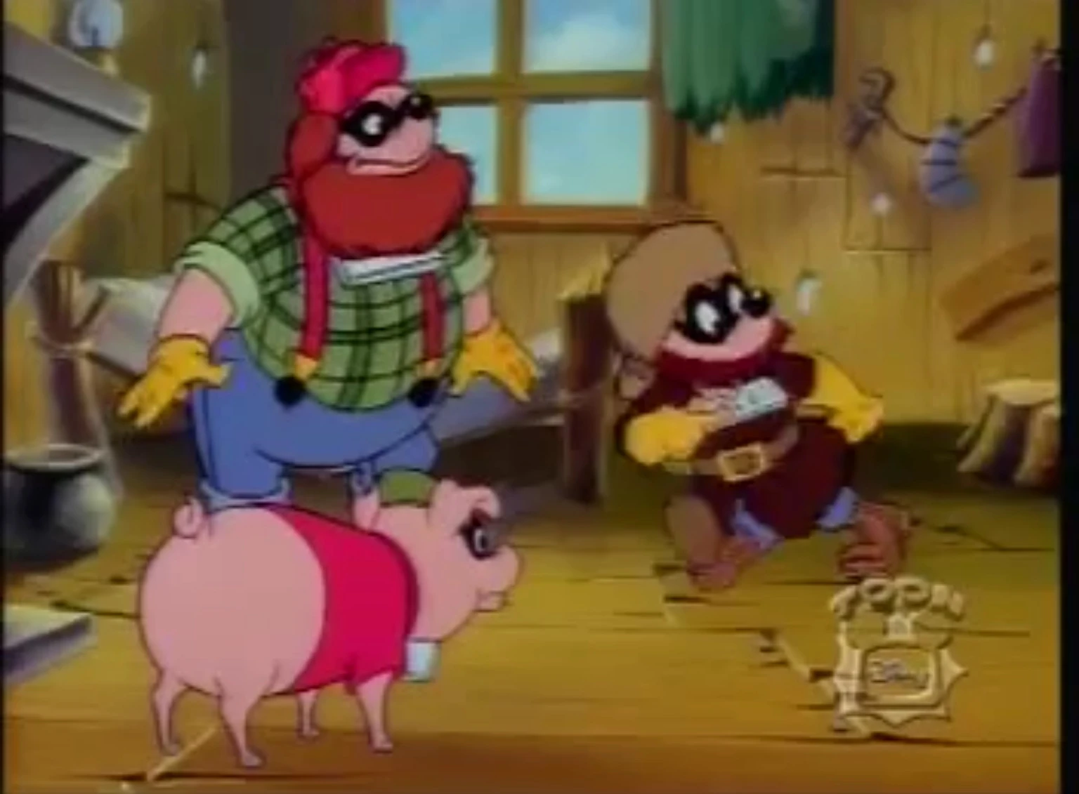 - Bacon is likely a pet pig, to Backwoods and Binky. He wears the red shirt, black mask and green cap, like the Italian made comics’ Beagle Boys’ pet dachshound dog, Ottoperotto.