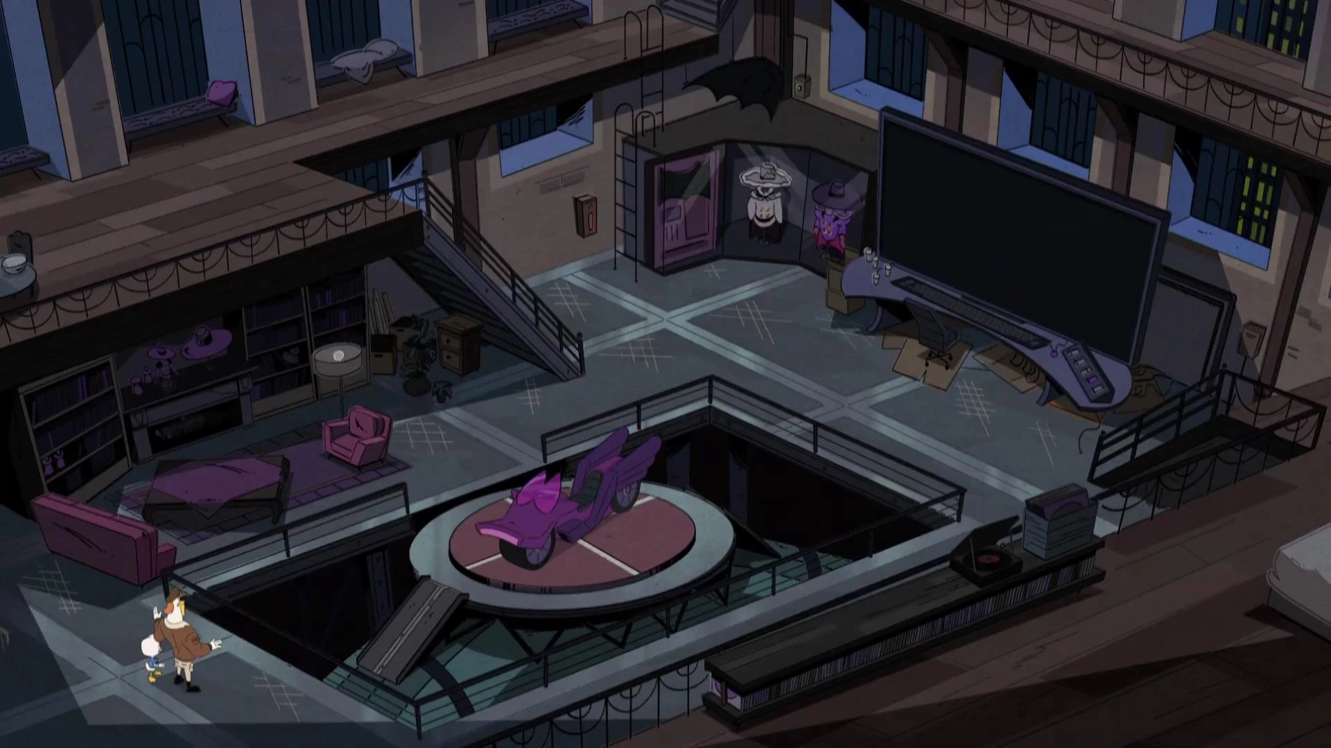 Drake took up residence in Darkwing Tower some time after choosing to adopt the mantle of Darkwing Duck as a real crimefighter, rather than a movie role. He was aided in outfitting his hideout by Fenton Crackshell-Cabrera, oblivious to the fact that Fenton was also his "rival" superhero Gizmoduck. Among the features included were W.A.N.D.A., a somewhat sarcastic crime computer, and an elevator platform that allowed Drake to enter and exit the tower using his Ratcatcher motorcycle.