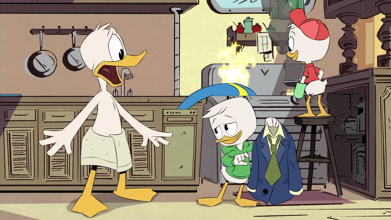 A little while after Donald and the boys have moved in during "Daytrip of Doom," Scrooge begins to get frustrated with the new lifestyle, specifically because of Donald using his bathroom as his laundry room. During the meeting to discuss the house rules, Donald is the only one who stands against the reule, believing them to be unnecessary while also refusing to obey any commands set out by the housekeeper Mrs. Beakley. Later as Beakley is vacuuming, she notices an enormous amount of chords and extended outlets all leading to Donald's houseboat.