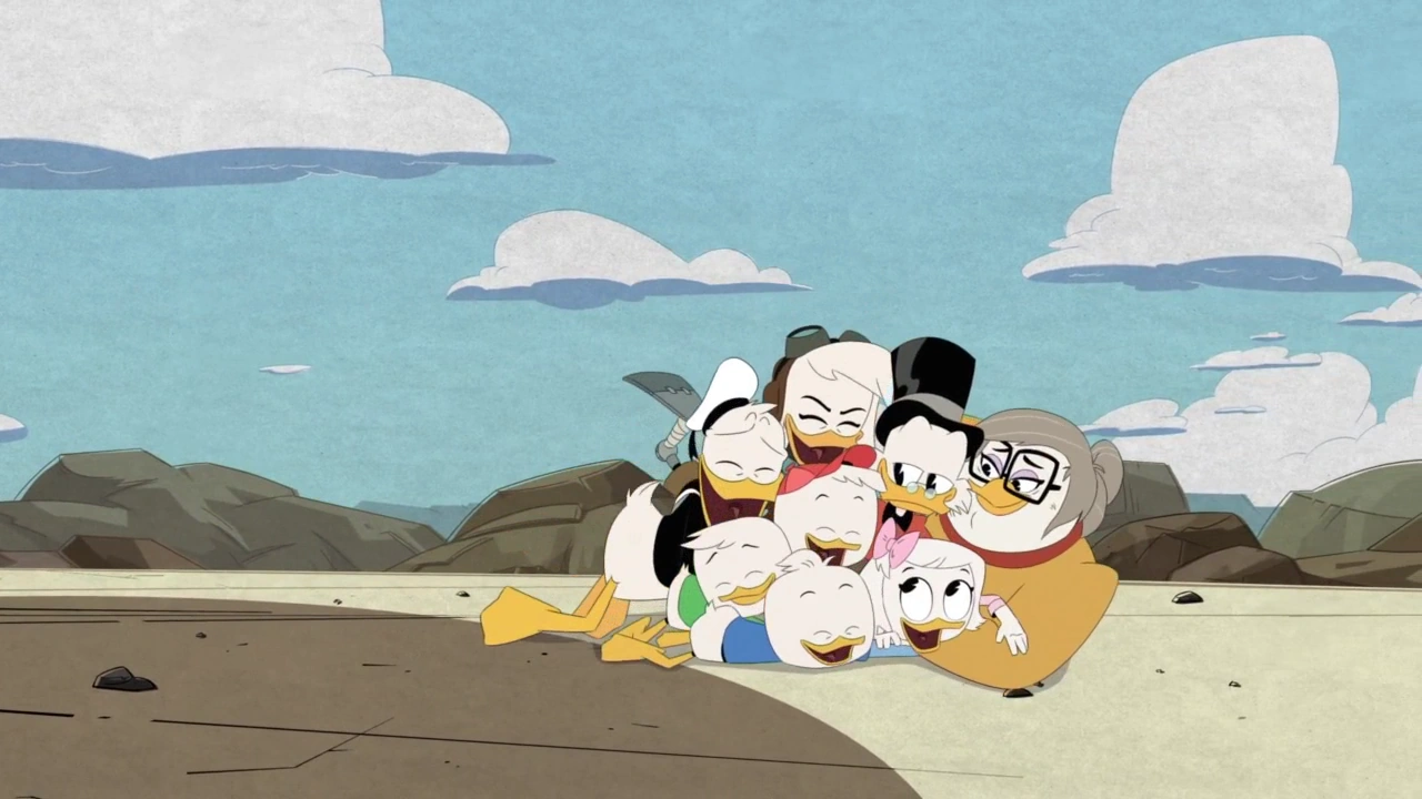 Scrooge, proving as overprotective a father figure as his nephew, is calmed by the assurances of his great-nephews and newfound daughter. Launchpad, thrilled by the group's success, leaves the controls to grab the Ducks in a group hug, with Della thankfully taking over steering before they can crash. Relieved not to have made an even bigger mess, Launchpad accidentally hits the button to open the cargo door, sending the entire group flying out the back of the plane. Of course, the heroes soon turn it into an unexpected free fall into a skydive through the end credits, only proper for a family of adventurers.