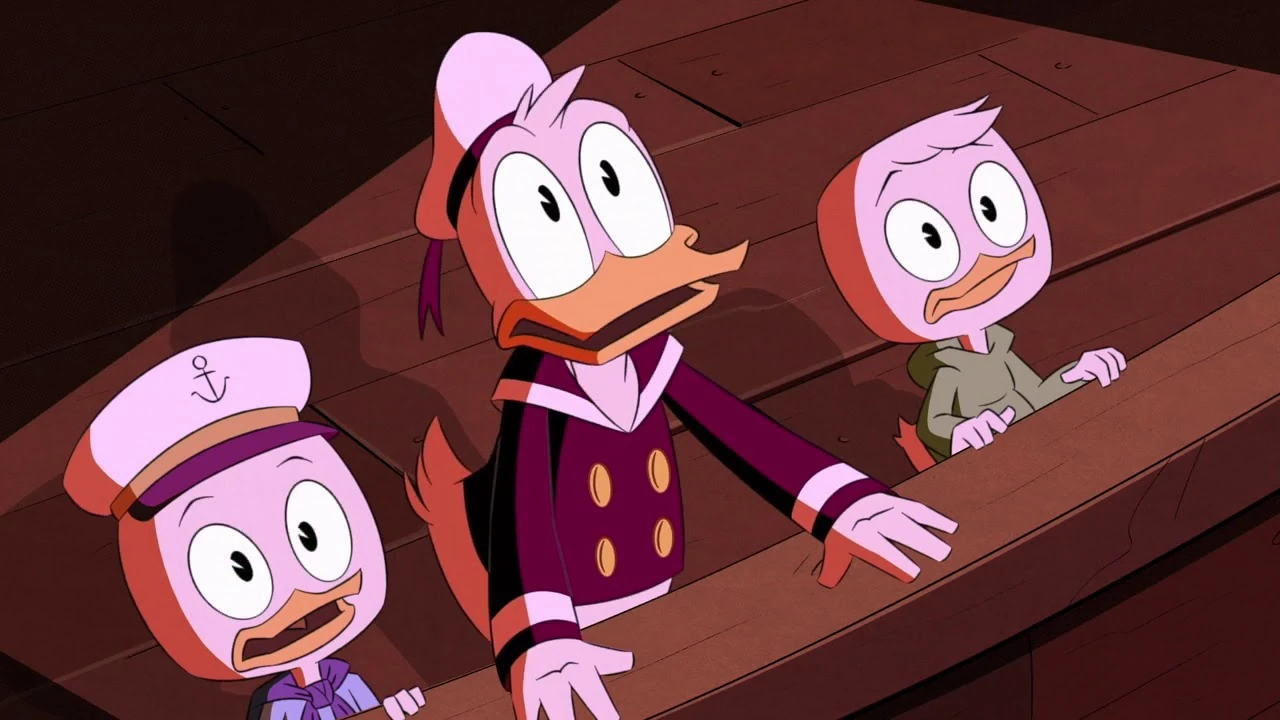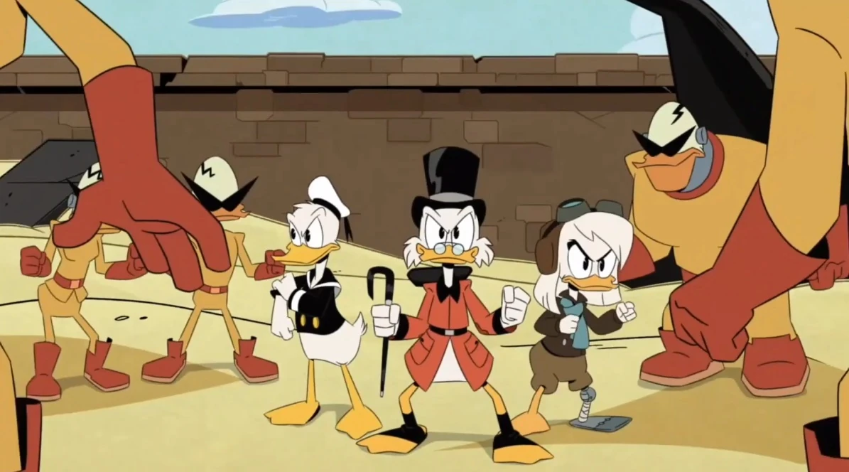 Scrooge awakens tied to a chair and is approached by Bradford, who notes that Scrooge's other friends and relatives, including Donald, have similarly been captured. Later, after the fight between Scrooge and Bradford, who is now armed by the Sword of Swanstantine, and arriving on the library roof Scrooge sees Donald, Beakley and Della captive and learns that the boys and Webby have also been captured.