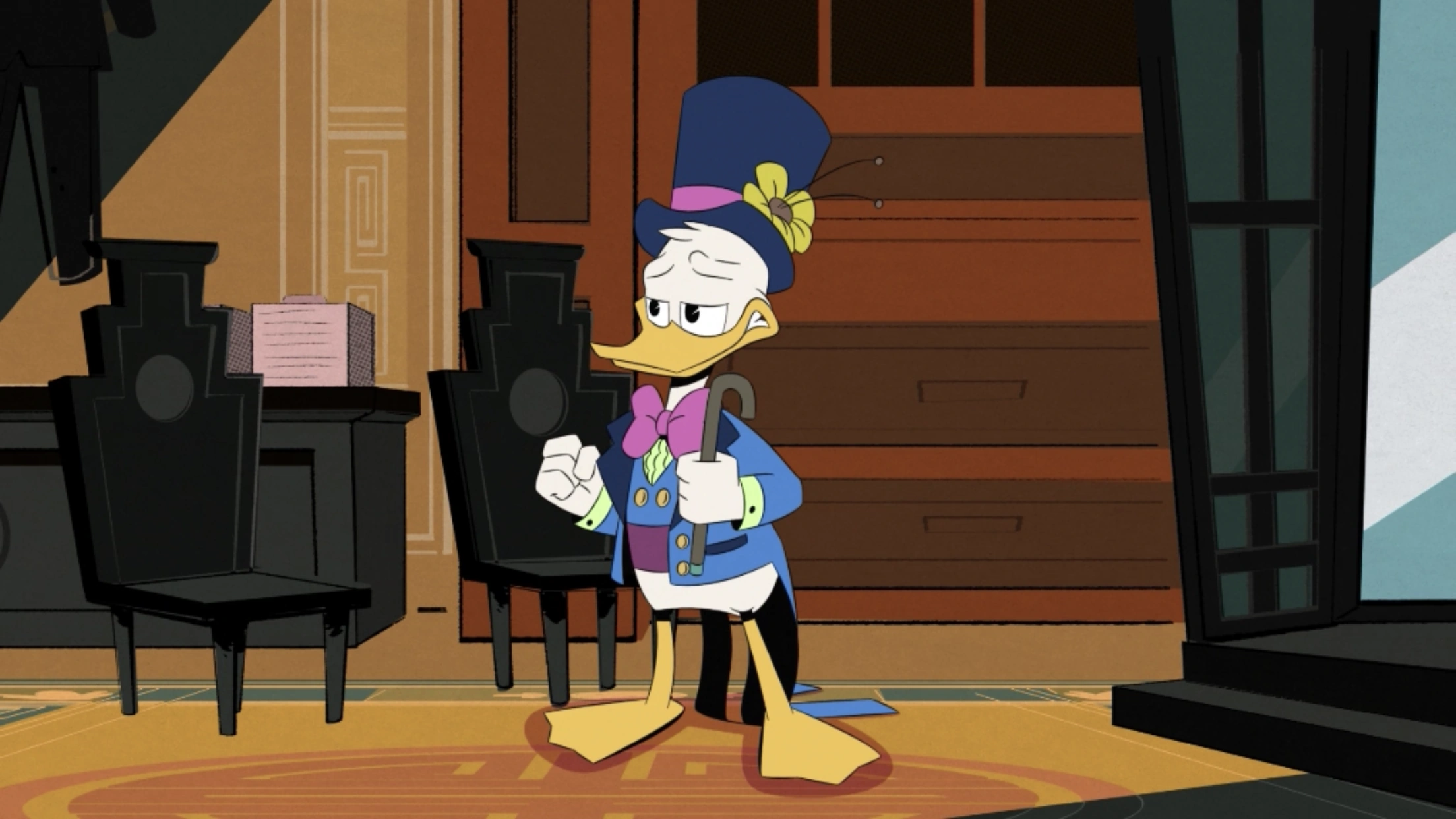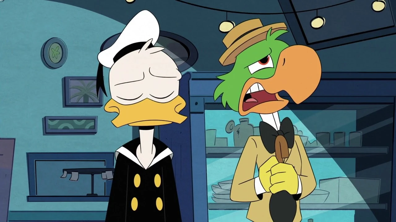 Sometime after in "The House of the Lucky Gander," Donald decides to join the gang on the trip to Macaw to help his cousin Gladstone Gander, after a call for help was recently sent to McDuck Manor. Although Huey claims one of Donald's mottos is family always helps family, Donald is still hesitant in helping due to his jealousy of Gladstone's supernatural good luck ever since they were young. They then land by the docks in front of a hotel known as The House of the Lucky Fortune, where they enter the building and take the elevator up to the penthouse where Gladstone's supposed to be. Although they hear cries for help at first as Donald and the gang enter the room, they soon realize it's Gladstone enjoying a massage from one of the panda employees.