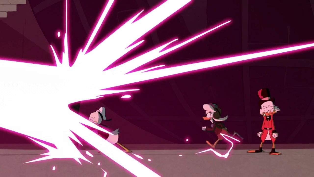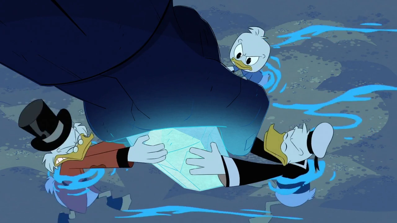 He attempts to blast the still defenseless Scrooge, but Donald puts up a barrier and is joined in holding it by Della (who tells to Donald that she has nothing against his trip with Daisy now, after Della almost lost him and her family again and in this time forever), Webby, Dewey, Beakley, and the reformed May and June.