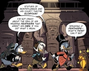 While walking down a hallway, Scrooge came across a bird-like artifact in a cage. Della examines the artifact while Scrooge recognizes the bird as the greatest treasure Montemplumage ever owned, the Golden Chicken. Much to the confusion of the group, the chicken came to life and begins to attack the group. Scrooge deduces that the chicken was not Montemplumage's greatest treasure, but actually his greatest nightmare. The chicken begins to grow in size as it continues to assault Donald while Scrooge and Della try to come up with a solution to stop the being.