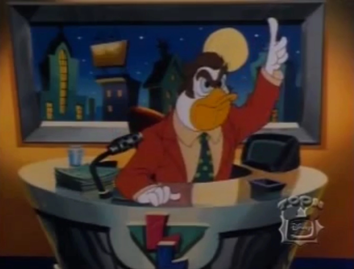 Though he calls himself a "news reporter" and refers back to "the studio" at the end of the press conference, Loudmouth has his own independent television show. He always seeks out the biggest topics in the city for his show, and makes up brazen lies to make them sound like bad news. Since Scrooge McDuck is big news in Duckburg, Loudmouth has been harassing Scrooge for a whole month. When Scrooge dons a superhero costume in an attempt to prove that he's not the bad guy, Loudmouth dons a similar costume to frame Scrooge for crimes he hasn't committed.