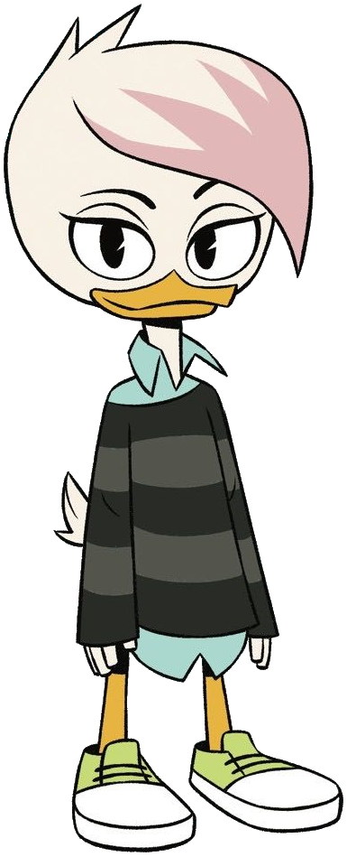 Lena is a slim teenage duck with white hair with the end being pink who wears a teal collared shirt with a black long-sleeved shirt (that she claims to have got off the lead singer in a band from Paris) with gray stripes over it, and light green laced shoes with the tip being white. In her pajamas for a sleepover with Webby, Violet, and the boys, she wears a one-piece black sleep-robe with a loose mint green t-shirt and is barefoot. After gaining her own magic, she gained a white outfit with teal gloves and tights. Her eyes were also full blue, and her hairstyle was overturned.