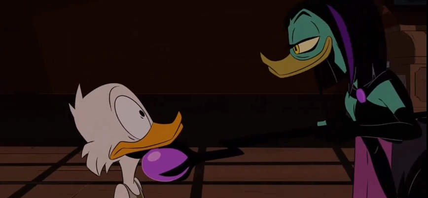 Magica and Lena briefly battle each other to a point where Magica falls to the ground. Lena tells her that she wants to use her new magic powers for good and she leaves Magica. Lena then flies off with Webby and Violet back to the mansion.