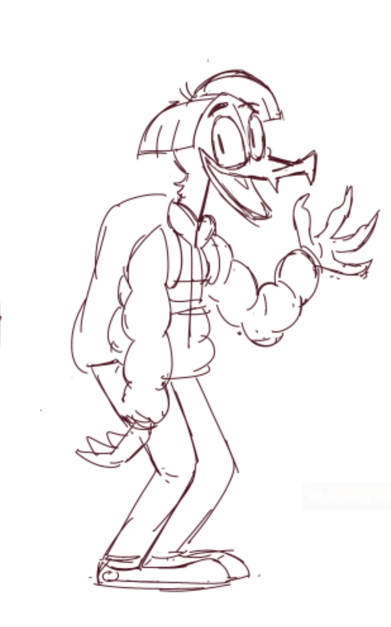 Though most sketches of The Wereduck are uncolored, we can get a decent description out of what there is. They wear a dark-green puffer jacket, along with a large backpack (though this could just be a temporary addition). The Wereduck keeps some more wolf-like features, such as their fangs and claws.
